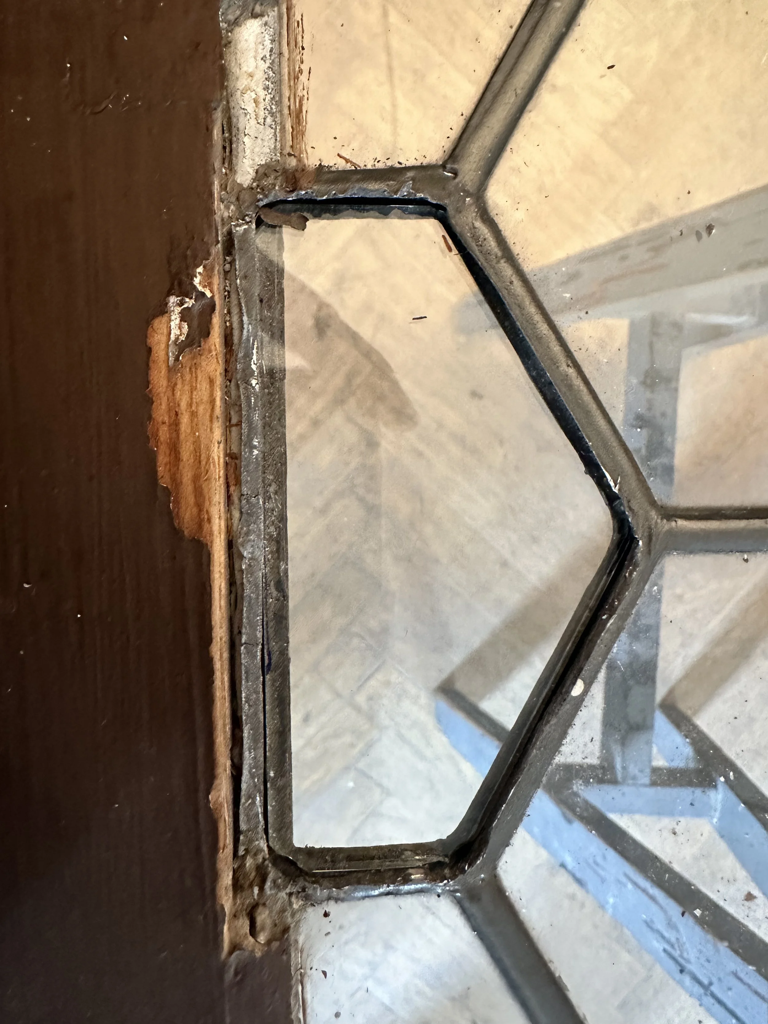 Der Knauf des äußeren Fensterflügels schlug durch die Bleiverglasung.