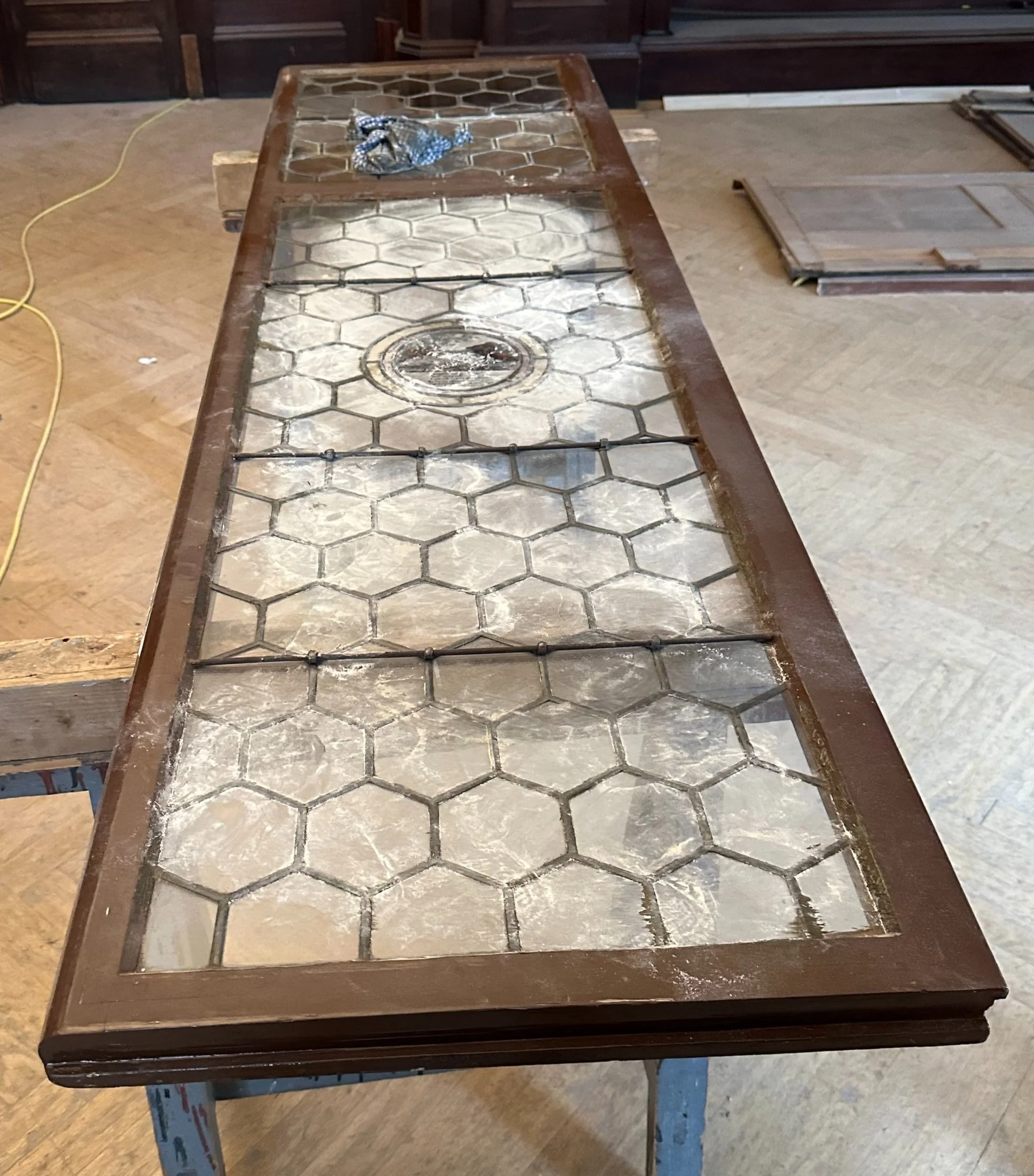 Die Bestandsaufnahme hat gezeigt, dass insgesamt acht historische Holzfensterflügel mit kunstvoller Bleiverglasung und eingebetteten, handbemalten Glasscheiben restauriert werden müssen. Die Verglasungen weisen erhebliche Schäden auf: Mehrere Glasteile sind gebrochen, zahlreiche Bleiprofile zeigen Brüche, und die gesamte Struktur benötigt eine sorgfältige Nachkitten und Stabilisierung.